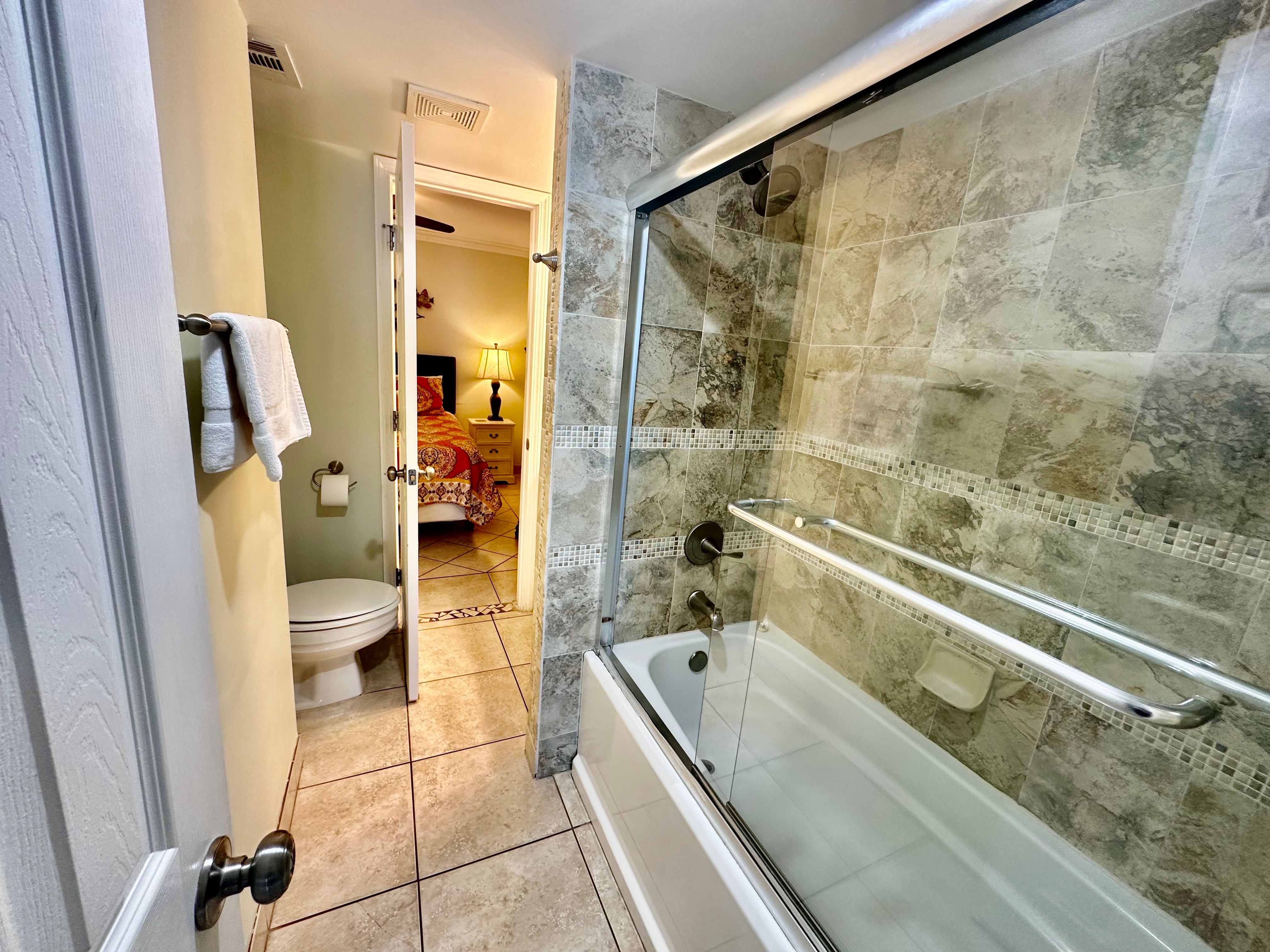 The bedroom includes a queen bed with new mattress and bedding, cozy linens, a smart TV, tile flooring, and a large ceiling fan. The bathroom features a spacious tiled shower with glass door, a beautiful vanity with upgraded fixtures, and plenty of space. All linens and towels are provided—including beach towels.