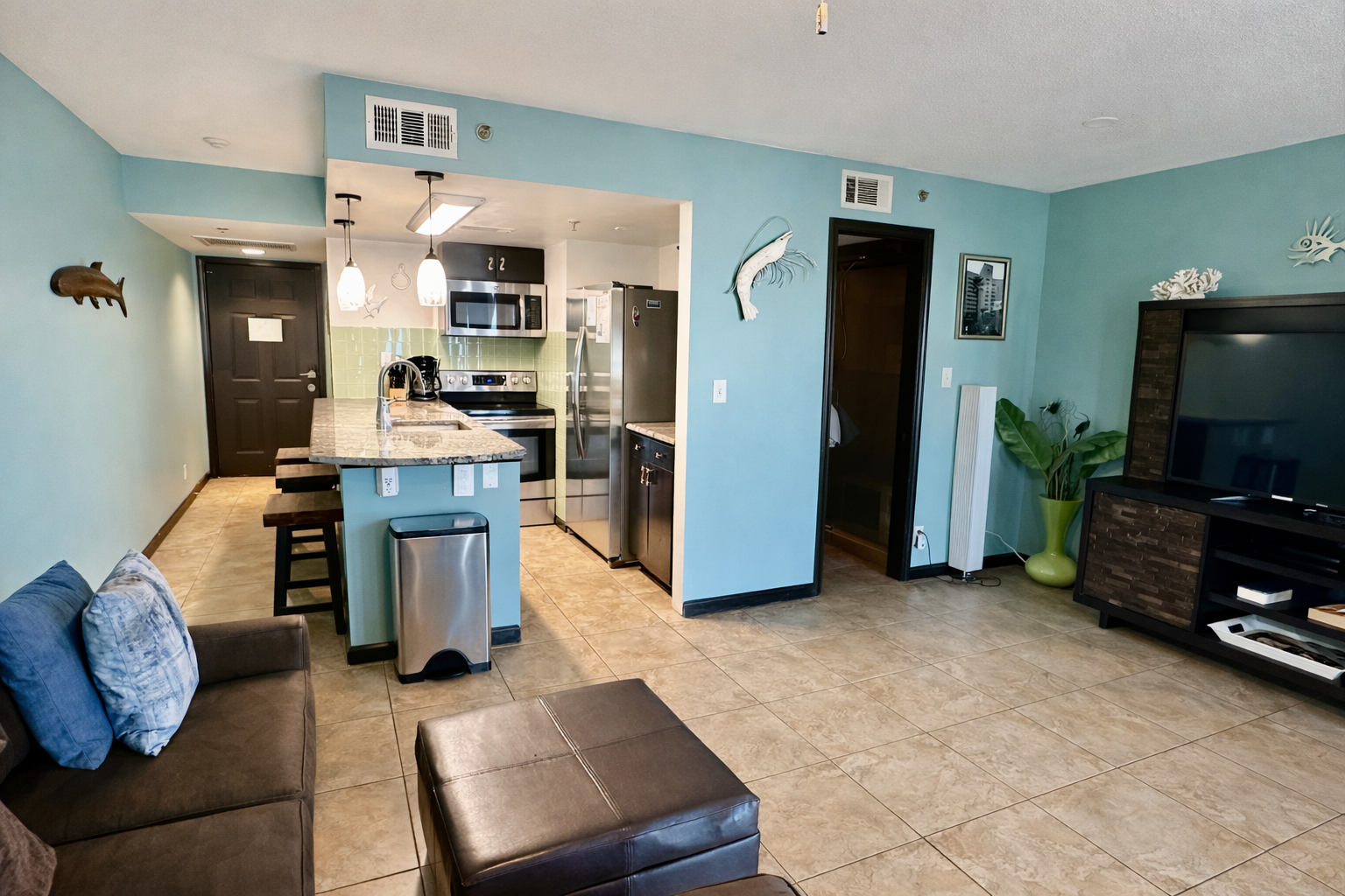 LARGE tv and comfortable seating, tile floor throughout