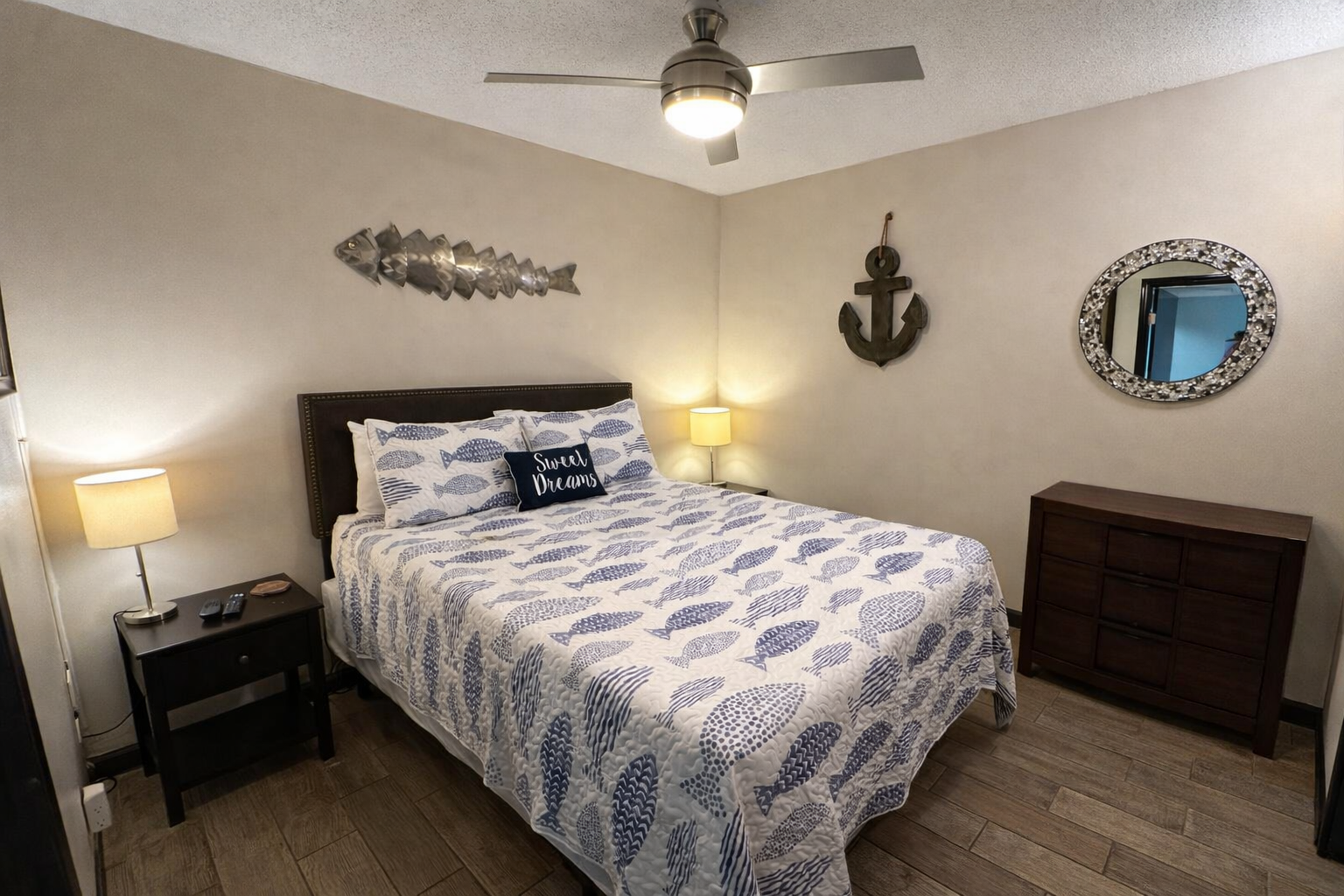The comfortable living room includes a queen sofa sleeper, plush seating, and a large flat-screen TV with cable and free Wi-Fi. The bedroom features a queen memory foam mattress, smart TV, soft linens, tile floors, and large ceiling fans for added comfort. The bathroom offers a spacious walk-in tile shower with glass door and an upgraded vanity. All linens and towels are provided—including beach towels.