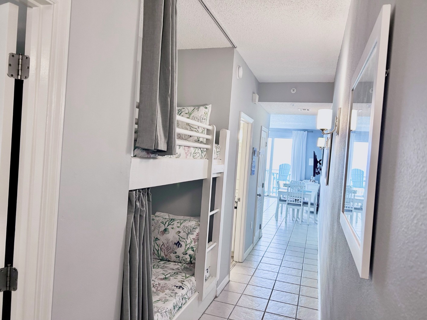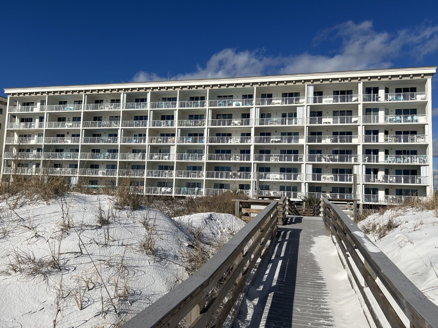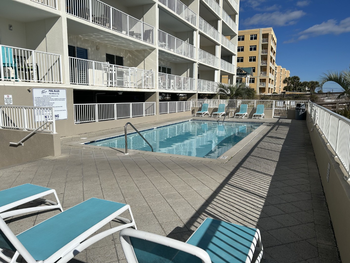Escape to our meticulously curated 1-King bedroom, 1.5-bath condo, where coastal charm meets modern comfort. With a master bedroom featuring a plush king-sized bed, cozy hallway bunks with privacy curtains for the kiddos, and a pullout sofa sleeper in the living room. Our condo comfortably accommodates up to 6 guests. Step onto the balcony and immerse yourself in the breathtaking panoramic views of the gulf, natural dunes, and our seasonally heated pool. Sip your morning coffee or indulge in a leisurely meal while soaking in the sunshine. Experience the symphony of ocean waves serenading you throughout the day. Witness both the sunrise and sunset from the comfort of your retreat or simply meander down to the sugar sands to catch the views.