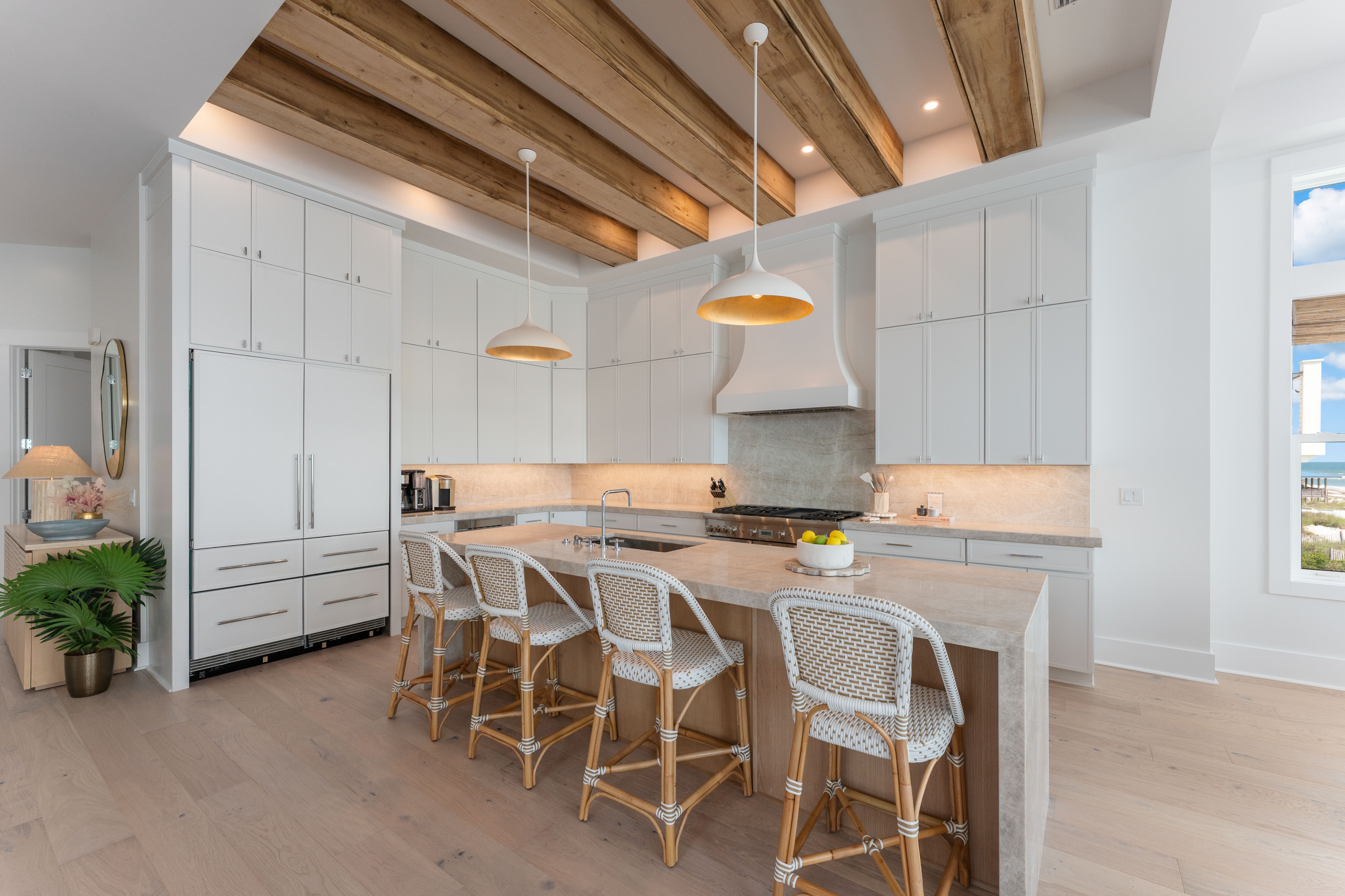 The chef’s kitchen is fully stocked for any culinary adventure, boasting top-of-the-line appliances, a large center island, and high-end cookware. Whether preparing casual beachside snacks or gourmet meals, this kitchen has everything you need.