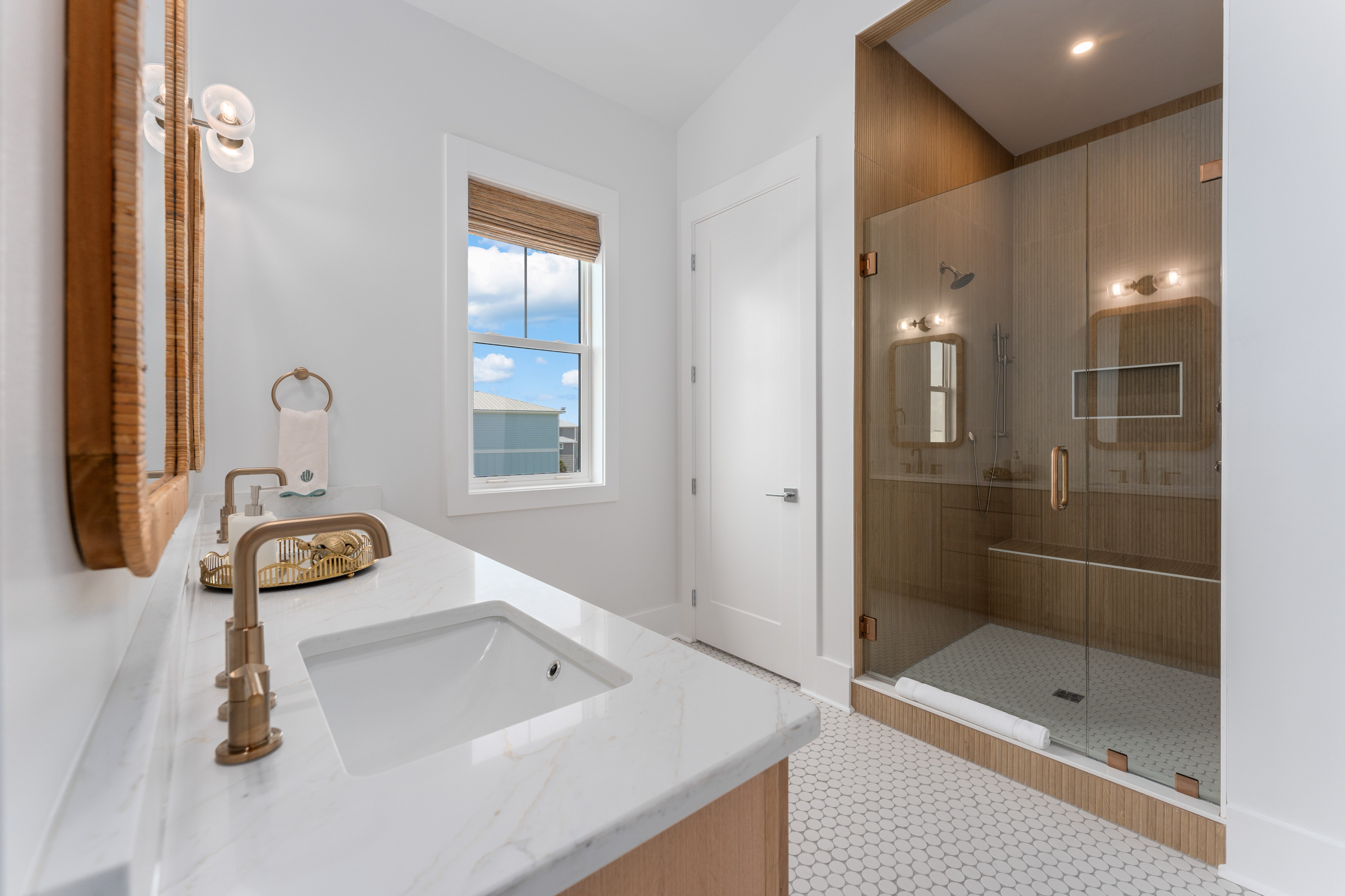 Four King Suites (3 on Third Floor & 1 on Second Floor) – Each with its own private en suite bathroom, designed with elegant Moroccan-inspired tilework and spa-like finishes. In the two Third Floor Gulf front Master Suites, wake up to breathtaking Gulf views and enjoy private porch access through large sliding glass doors.