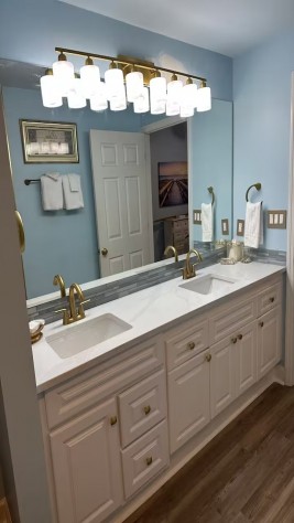 Spacious quartz elongated counter with double sinks, perfect lighting