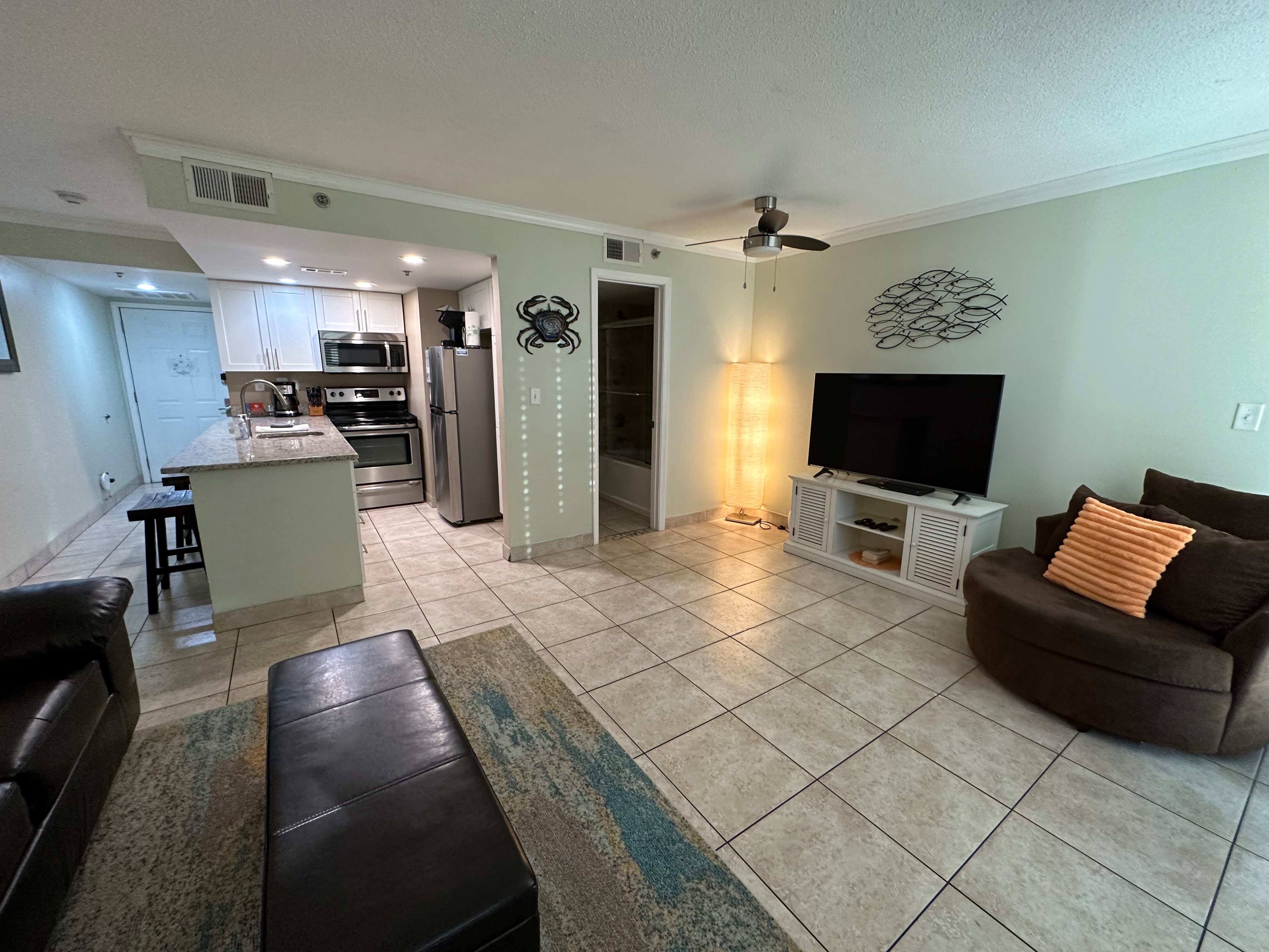 The condo has been totally renovated with upgrades throughout. The gorgeous kitchen features stainless-steel appliances, marble countertops, and is fully stocked with everything you need. The living area offers comfortable seating, a queen sleeper sofa, and a large 55” TV with Direct TV, plus free high-speed Wi-Fi.