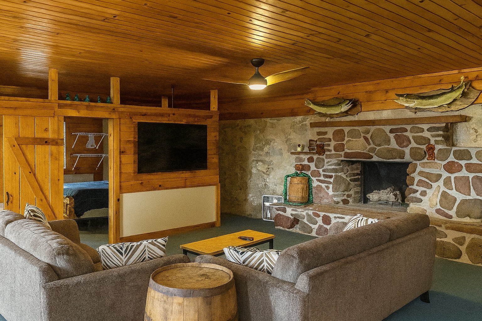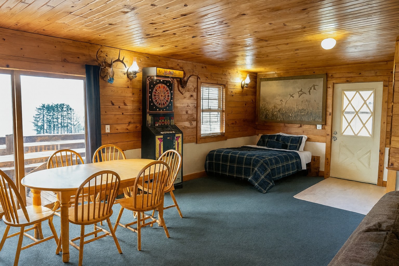 The Loft cabin is one of our largest of 6 cabins ready for you to enjoy at Cedar Ridge Resort. This stunning open floor plan has a private entrance and deck with beautiful views of the Mississippi River backwaters. The Loft has kitchen, living area with new couches and a large smart tv, bathroom with shower, and 2 sleeping areas - a bedroom with full-size bunked beds and a twin bed, and another area with two full beds and a privacy curtain. There is one additional twin bed for sleeping. Linens are provided for the beds, guests will want to bring towels (Bath, Kitchen, etc) and any consumables you may need. A few garbage bags and toilet paper rolls are provided, you may want to bring more depending on your needs.