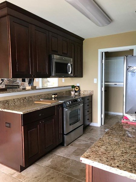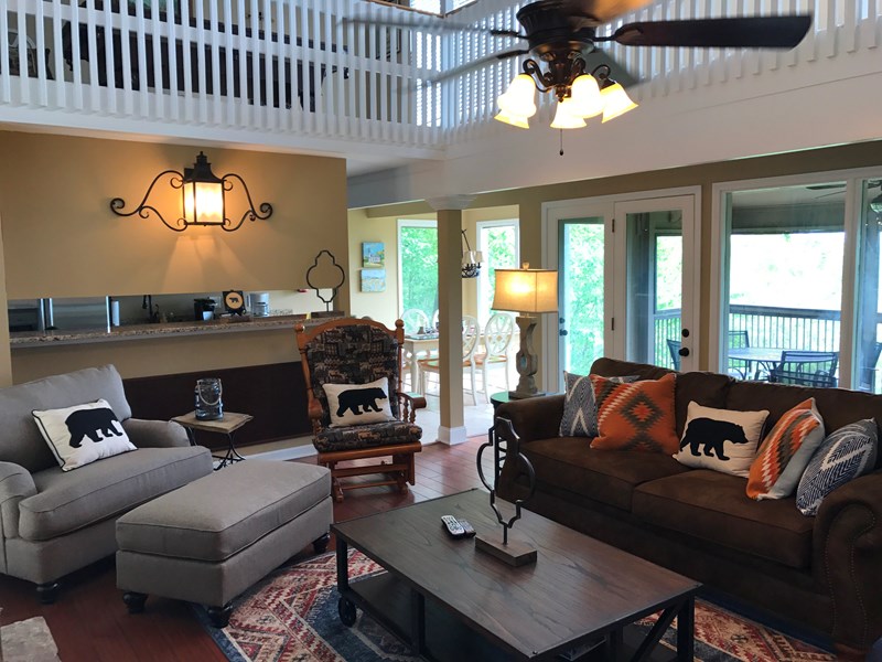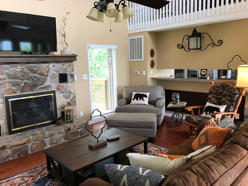 Cabin Layout & Comforts With 3 bedrooms and 3 full baths, three levels, and an open main floor layout, Bear View cabin will comfortably accommodate the entire family. Each of the 3 levels provides you with options to meet the wishes of everyone in your family. Vaulted ceilings in the living room with fireplace, a fully equipped kitchen.