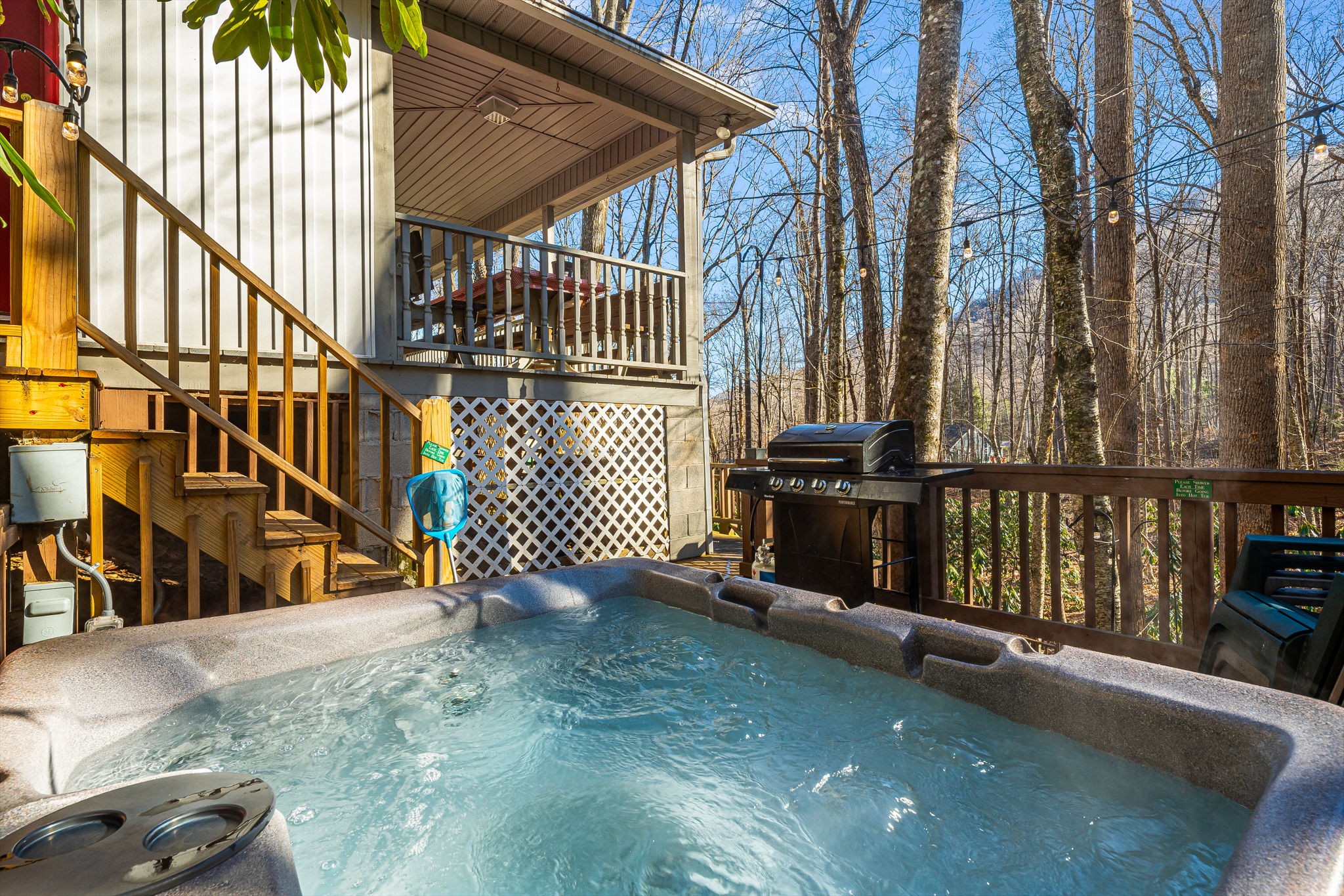 • BBQ Grill   Hot Tub   Porch   Porch Furniture   in the woods and next to the creek