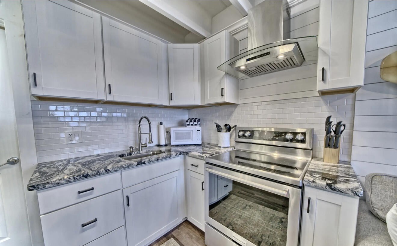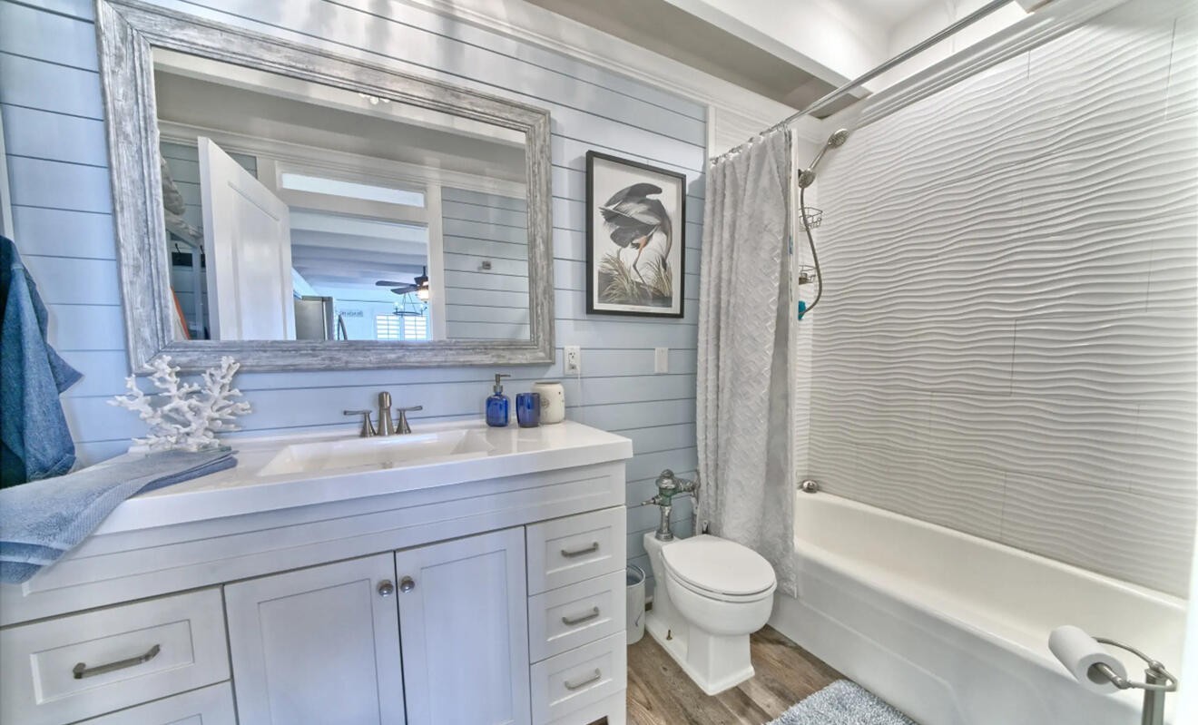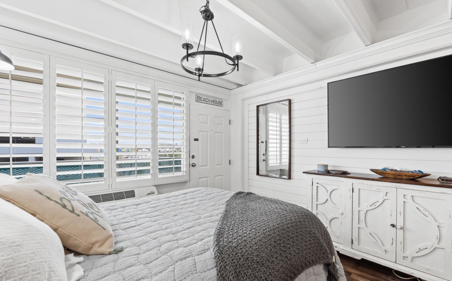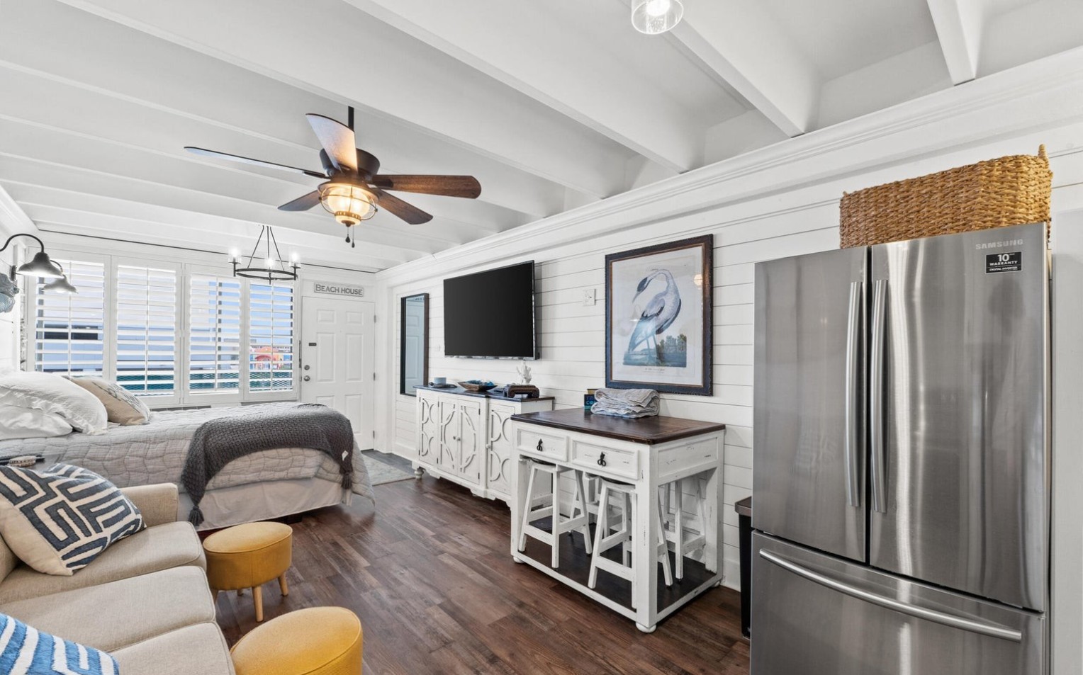 The spacious living area is thoughtfully designed with contemporary furnishings, light-filled windows, and stylish decor that complements the beachside vibe. The fully renovated kitchen boasts modern appliances, granite countertops, and ample cabinetry—perfect for preparing delicious meals after a day of sun and surf.